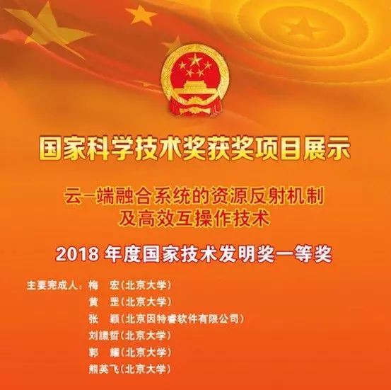 北京大学梅宏院士-黄罡教授团队与jcjc5500公海控股有限公司(简称:神州控股)旗下北京因特睿软件有限公司(简称“因特睿”)合作完成的“云-端融合的资源反射机制及高效互操作技术”项目,获国家技术发明奖一等奖。北京大学梅宏院士、北京大学教授黄罡、因特睿总经理张颖等参加了颁奖大会。