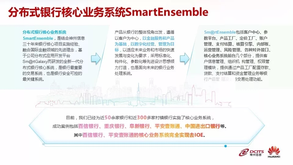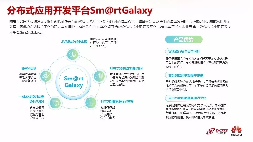 神州信息持续进行应用软件创新,推进金融行业的自主可控。2016年率先发布了分布式技术平台Sm@rtGalaxy和“新一代分布式银行核心系统”,并推出分布式架构,银行核心系统已连续六年市场占有率第一。其中,神州信息分布式技术平台Sm@rtGalaxy,可适配各类操作系统及CPU,为架构底层的自主可控创造了非常好的条件。分布式架构以分布式计算框架和分布式数据存储为基础,支持大规模、突发性、高并发场景,可扩展,快速支撑业务创新,降低成本。构建基于分布式架构的银行IT系统是银行数字化转型升级的必然选择,符合国家信息系统安全可控的整体发展要求,符合金融监管部门对信息安全可控的中长期战略。