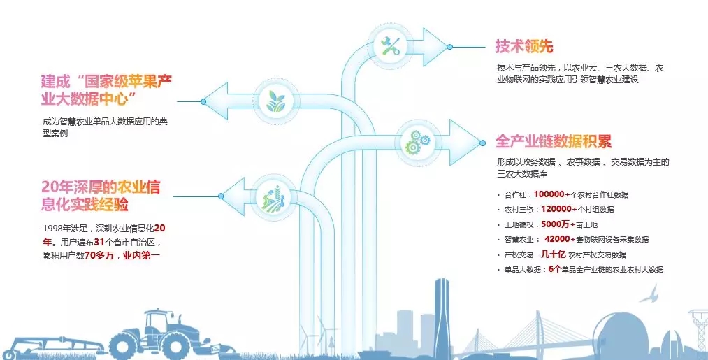 根据2019年中央《一号文件》,实施数字乡村战略,加强数字农业农村系统建设是农村产业壮大、拓宽农民增收渠道的重要举措。神州信息紧跟国家政策,以农业农村大数据为基础不断完善数字农业农村解决方案,2018年落地首个“国家级苹果产业大数据中心”,为农业农村大数据发展提供示范和借鉴。未来,将以金融科技为抓手,大数据为驱动,积极探索解决农业农村发展过程中的征信难、融资难等问题,完善智慧农业产业链。