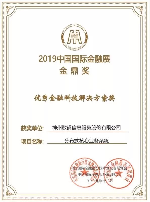 近日,神州信息自主研发的分布式核心业务系统再获重量级奖项——“2019中国国际金融展金鼎奖:优秀金融科技解决方案”!而就在上周,神州信息 “分布式银行核心业务系统关键技术与应用”刚刚斩获由中国电子学会颁发的“2019中国电子学会科学技术奖”,此次再获重量级奖项可谓双喜临门!