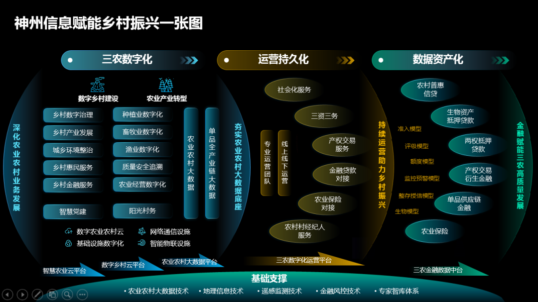 自1998年以农村电算化起步、涉足农业,神州信息20年来一直是全国农业农村信息化、数字化建设的排头兵。以“乡村振兴一张图”为指引,围绕农业农村数字化、三农数字化运营、三农数据资产化、三农数据基础设施建设等多领域,进行大量创新及实践,践行用数字技术实现普惠金融的使命,为全面乡村振兴提速。