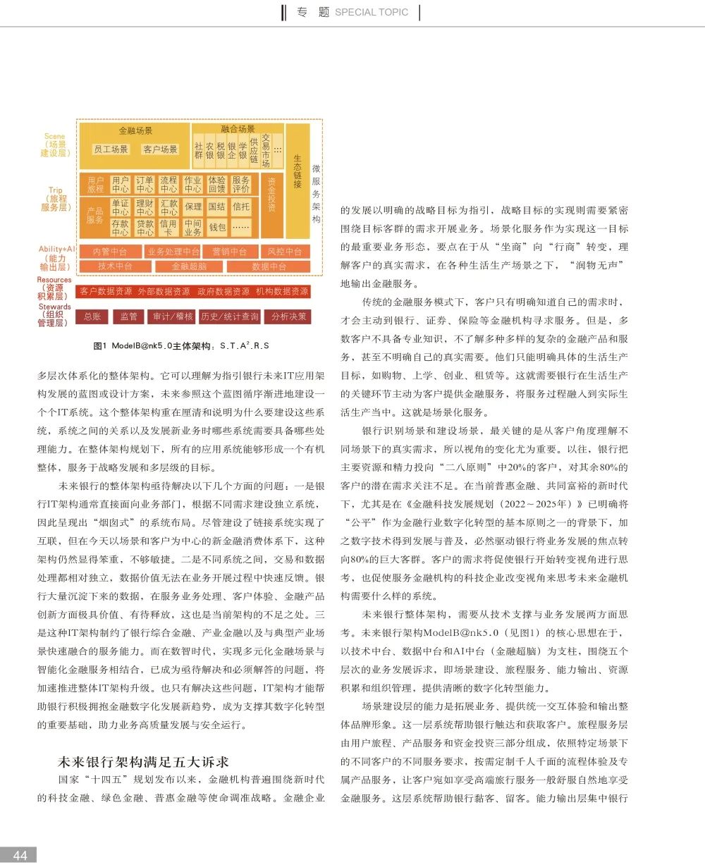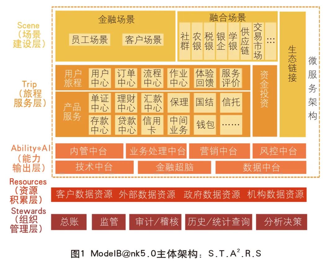五层架构不再以垂直业务范围区分稳态和敏态,而是从客户视角进行横向敏态和稳态业务的划分。传统的银行依照业务类型划分稳态和敏态,例如线上业务、零售业务(个人业务)属敏态业务,线下业务、对公业务是稳态业务等。但是,随着新一代消费者的成长以及未来生活生产习惯的巨大变化,业务发展已经出现线上线下业务融合、个人公司业务联动和相互借鉴的趋势。这种变化决定着未来只要是客户需要的服务,都不会呈现稳态,皆按需求发展而变化。因此,ModelB@nk5.0明确定义:直接面向客户的场景建设和旅程服务都属于敏态,真正稳态的是支撑敏态业务之下的银行能力沉淀和资源积累。通过敏态和稳态的重新划分,首先,能帮助银行为客户提供更加优化、符合需求的服务,也能横向将不同类型的客户服务中共性化、标准化的业务处理集中起来释放能量,整体降低服务成本,管控业务风险。其次,更加注重客户在银行服务中的体验,通过旅程服务的模式优化体验、提供精准产品服务。