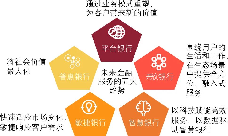人工智能、物联网、5G、区块链等新兴技术的发展加速推进了银行的数字化转型,未来银行的存在不再是一个只为客户提供储蓄、贷款等业务的场所,而是一个能够将新时代金融服务随时随地提供给客户的渠道,为未来金融服务打开了无限的想象空间。
