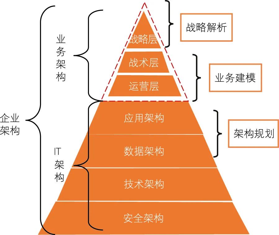 企业架构的价值,对于“领导层”,能够起到承接战略愿景,落实高层战略意志的作用,是领导者在战略落地过程中有效跟踪执行情况的“有形抓手”;对于“管理层”,部门间形成一套企业级的标准业务字典,有效促进了跨部门间的协作,降低了部门间的沟通成本;对于“执行层”,企业架构为一线员工提供有效的业务指导和操作手册,能够用以“客户”为中心、以“价值”为导向的思路重新思考业务操作。
