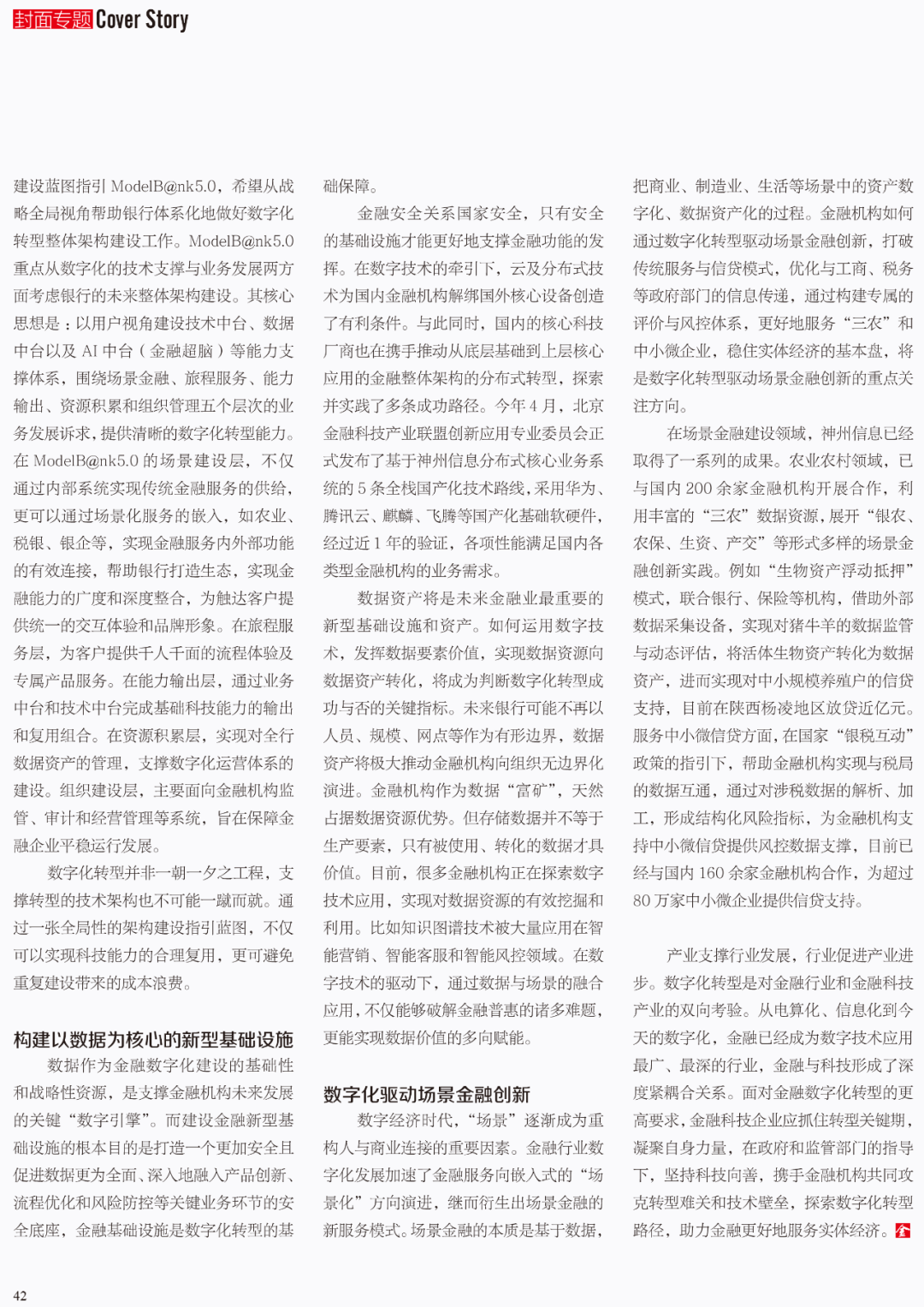 数据资产将是未来金融业最重要的新型基础设施和资产。如何运用数字技术,发挥数据要素价值,实现数据资源向数据资产转化,将成为判断数字化转型成功与否的关键指标。未来银行可能不再以人员、规模、网点等作为有形边界,数据资产将极大推动金融机构向组织无边界化演进。金融机构作为数据“富矿”,天然占据数据资源优势。但存储数据并不等于生产要素,只有被使用、转化的数据才具价值。目前,很多金融机构正在探索数字技术应用,实现对数据资源的有效挖掘和利用。比如知识图谱技术被大量应用在智能营销、智能客服和智能风控领域。在数字技术的驱动下,通过数据与场景的融合应用,不仅能够破解金融普惠的诸多难题,更能实现数据价值的多向赋能。