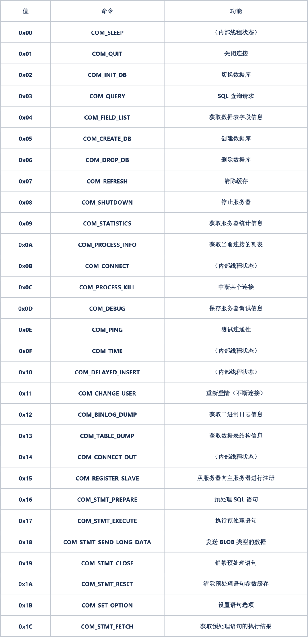 2. 在命令类型,也就是cmd指令上,MySQL是一个16进制的整数数来判断是哪一种命令,而PostgreSQL是以一个char字符来判断命令类型的。