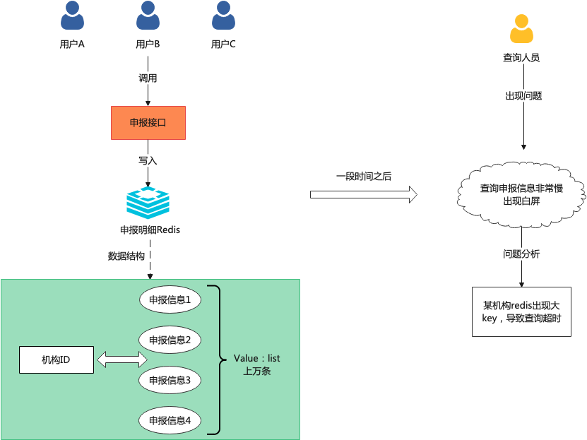 我们先假定有如下场景:某税务局一线运维收到客户反馈通知,说系统查询某机构对申报信息极为缓慢。于是开发人员找到一个出问题的机构A,通过搜索日志系统找到系统操作Redis时间比较久,并且从日志系统搜到一些Redis 含询超时的异常。最后我们定位到的原因如下:
