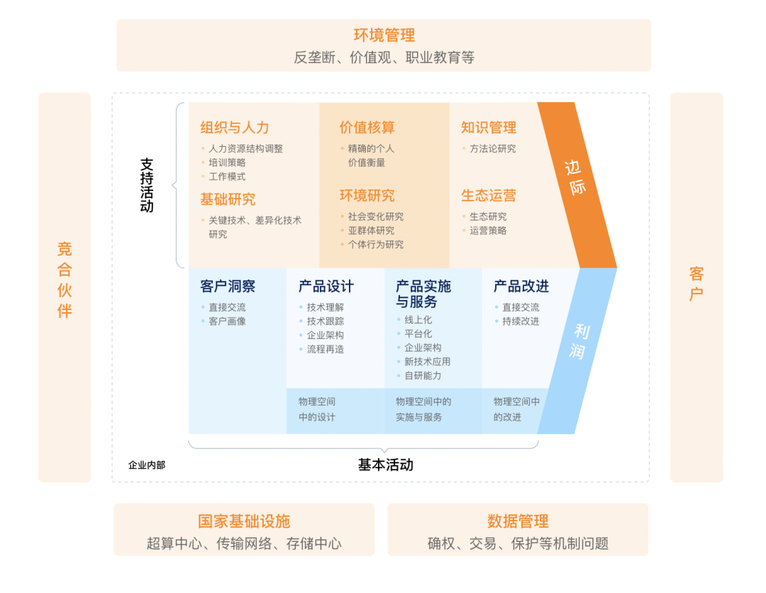 除了企业内部,我们还得关注外部的影响,国家基础设施、数据管理、环境管理等方面对企业未来的数字化转型方案是可能产生很大影响的,竞合伙伴也是需要企业在生态运营上随时考虑的,这些都是企业的外部能力,最后通过价值链整合成对客户的价值输出。