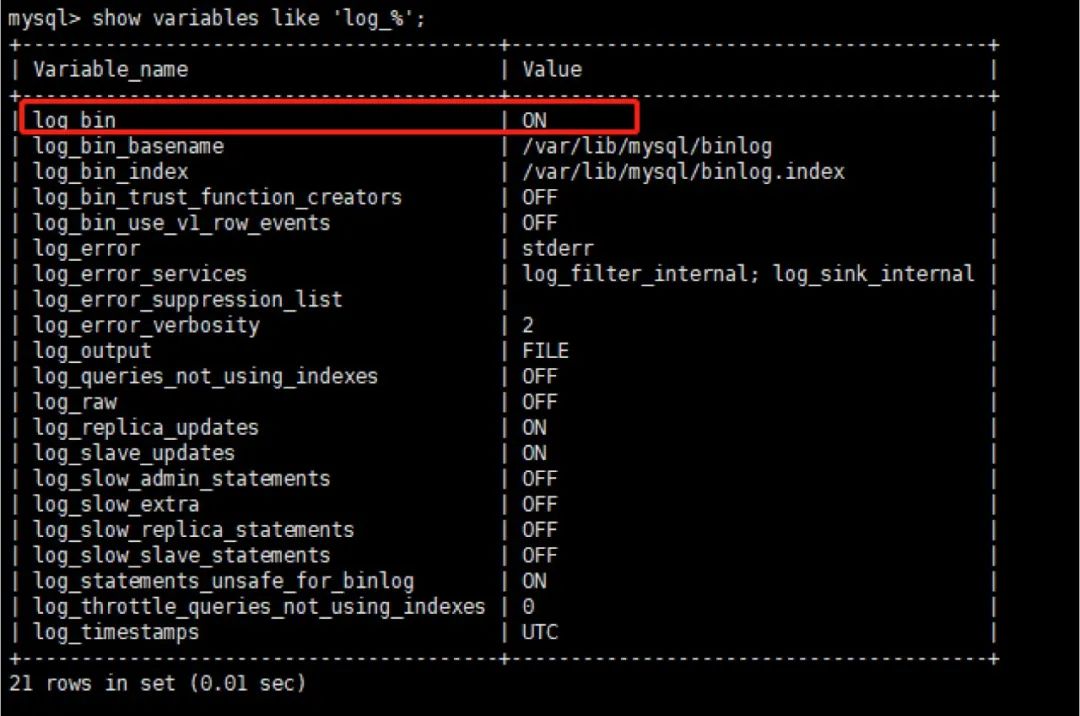 查看是否开启Bin Log日志 show variables like 'log_%';