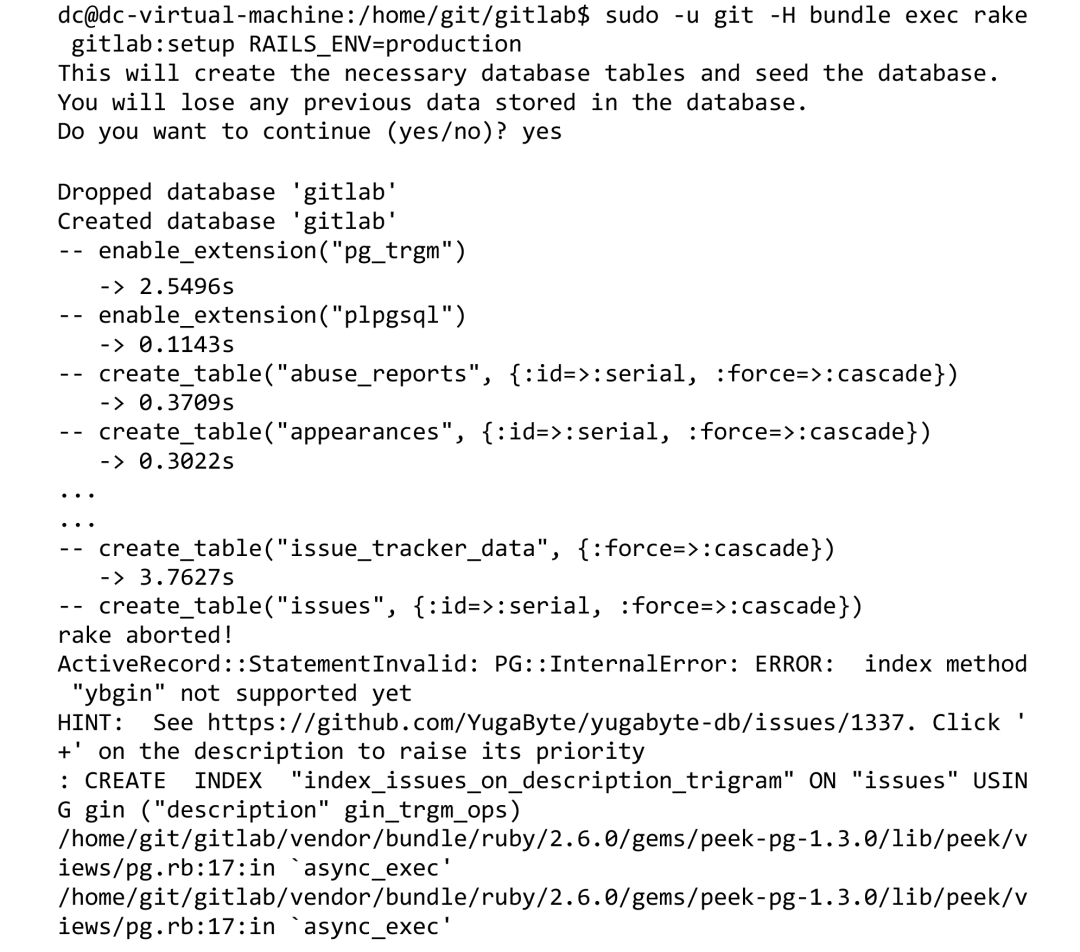 再次执行setup创建数据库,发现还是报相同的问题“ActiveRecord::StatementInvalid: PG::FeatureNotSupported: ERROR: unimplemented: extension "pg_trgm" is not yet supported”,说明新版本也无法支持extension特性。