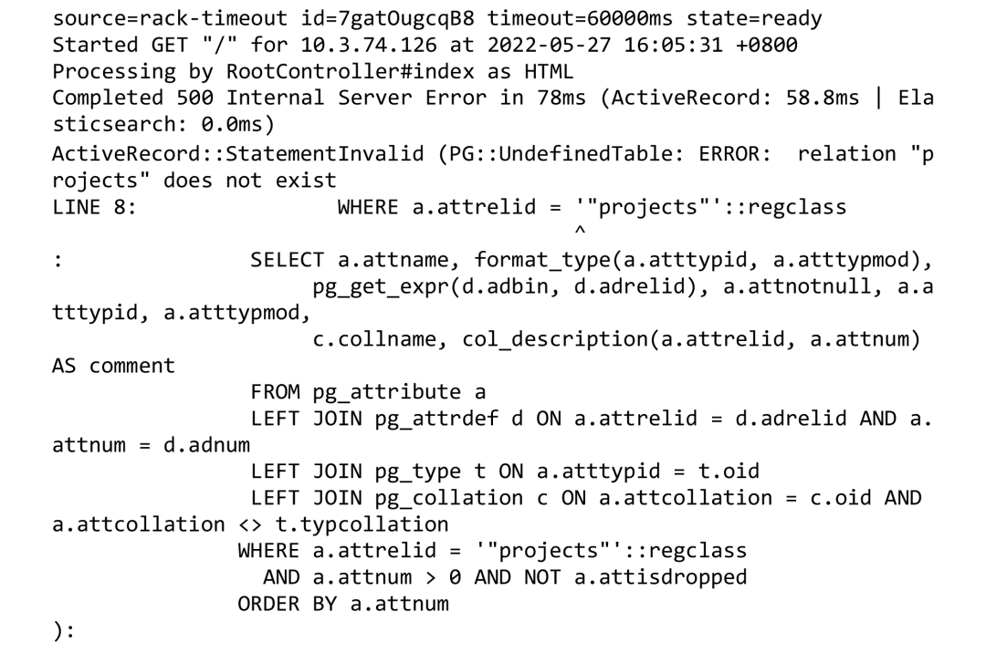 此时依然无法访问GitLab主页面,从日志里面发现报错原因是缺少目标表: