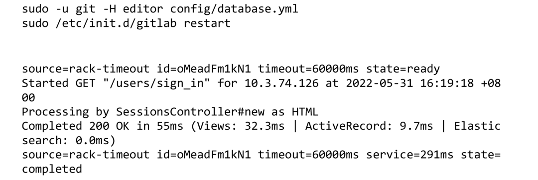 可以看到和标准PostgreSQL库对比完全一致。打开浏览器访问GitLab主页会自动跳转到登录页,查看日志无报错: