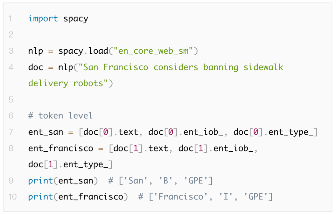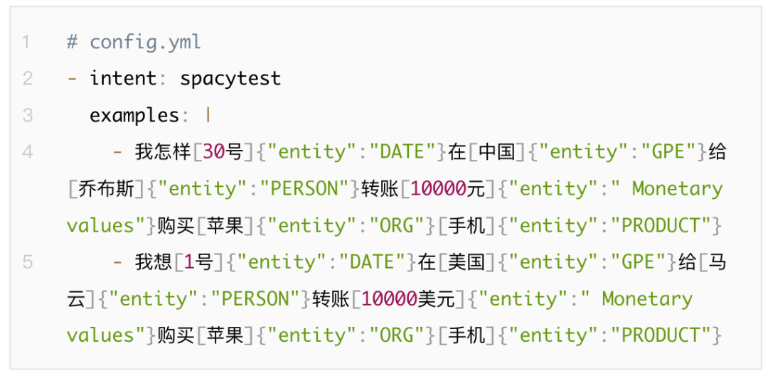 {'text': '可以找到泰餐吗', 'intent': '找饭店', 'entities': [{'start': 4, 'end': 6, 'value': '泰餐', 'entity': 'cuisine'}], 'text_tokens': [...], 'bilou_entities': ['O', 'O', 'U-cuisine', 'O']]}