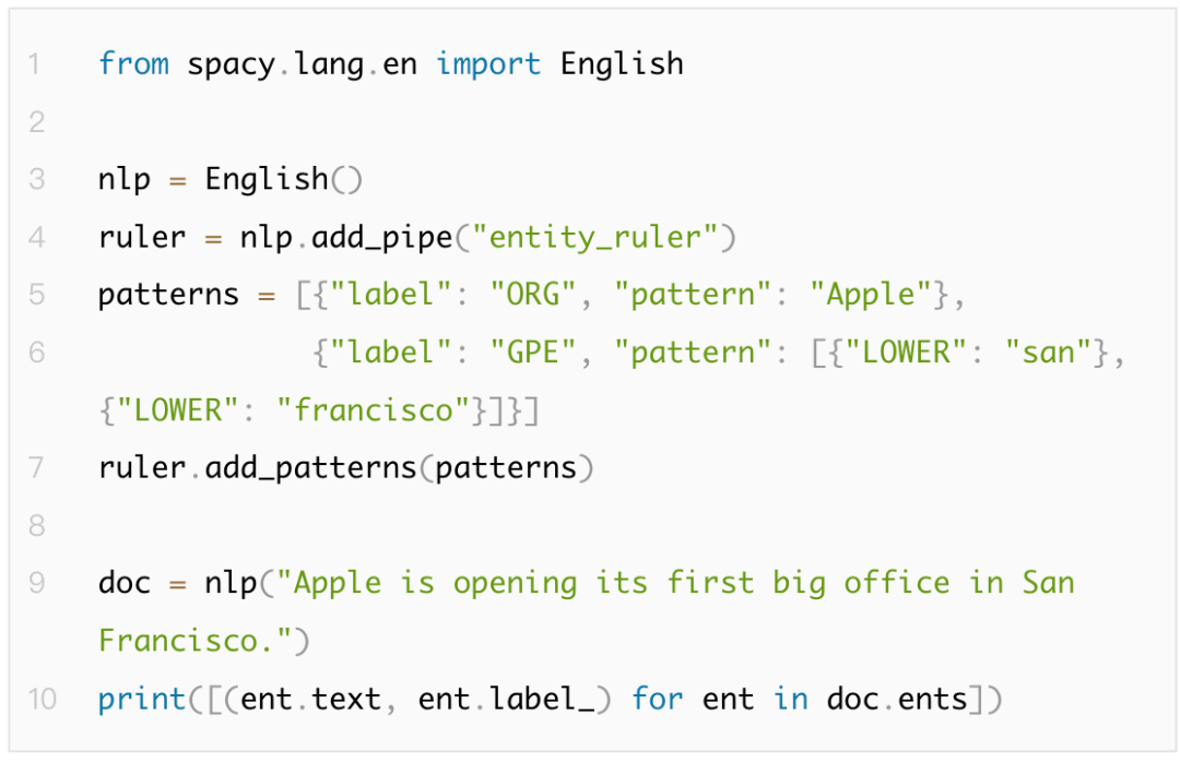 此组件只使用实体名称等于训练数据中定义的实体之一的正则表达式的pattern,所以训练数据中,要确保每个实体至少注释一个示例。