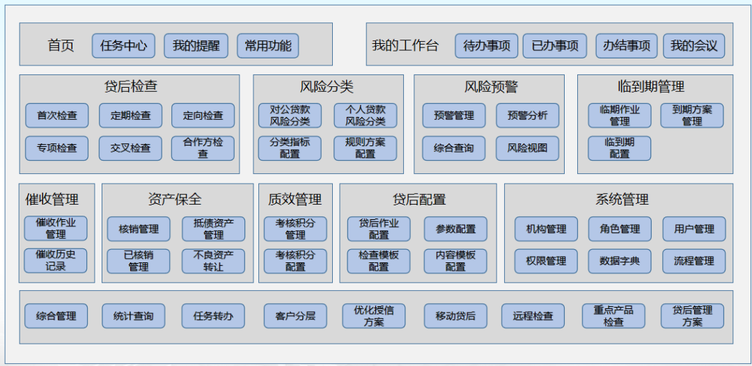 以各环节及全流程闭环管理为抓手,支持对信贷政策、授信审查、批复执行的复盘分析,不断完善贷后各环节小闭环,并形成授信管理全流程大闭环。