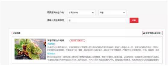 以大数据分析和挖掘,利用人工智能技术,通过病虫害的特征属性,系统自动地推荐出匹配的病虫害诊断和相应的处理方法及专家,为用户提供实时的、在线的、自动化的、智能的病虫害解决方案。