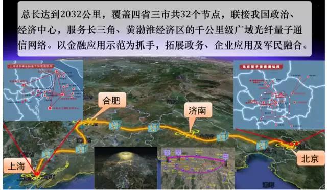 量子保密通信“京沪干线”技术验证及应用示范项目由国家发展改革委2013年7月批复立项建设。根据京沪干线初步设计方案,京沪干线总体目标是:建成连接北京、上海,贯穿济南、合肥等地的量子保密通信骨干线路;连接各地城域接入网络,打造广域光纤量子通信网络,建成大尺度量子通信技术验证、应用研究和应用示范平台。