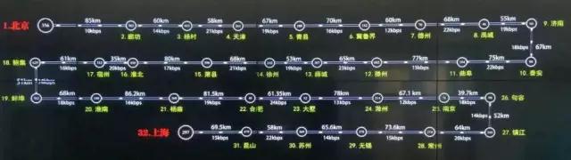 京沪干线32节点名称:北京、高村、王庆坨、天津、子牙、沧州北、东光、德州、禹城、济南、泰安、曲阜、滕州、薛城、徐州、庄里、符离、君王、禹会、吴圩、合肥、大墅、滁州、南京、句容、镇江、丹阳、常州、无锡、苏州、昆山、上海
