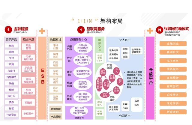 下图是华瑞银行互联网智慧银行的建设路径图,其背后所对应的便是“1+1+N”的架构布局。从架构布局上来说,第一个“1”指金融服务即以客户为中心,第二个“1”指互联网服务即融入互联网生态,“+N”指互联网的新模式即融合互联网创新服务和产品。华瑞银行互联网智慧银行的建设历程也清晰可见——54天建设的核心银行系统丰富完善了基础的业务能力,打造金融服务平台层;通过用户中心基础建设完成在线支付、投资、融资等12大平台建设,构建了互联网平台层;明确开放平台的架构定位并完成开放平台的基础建设;基于SDK提供综合金融服务。