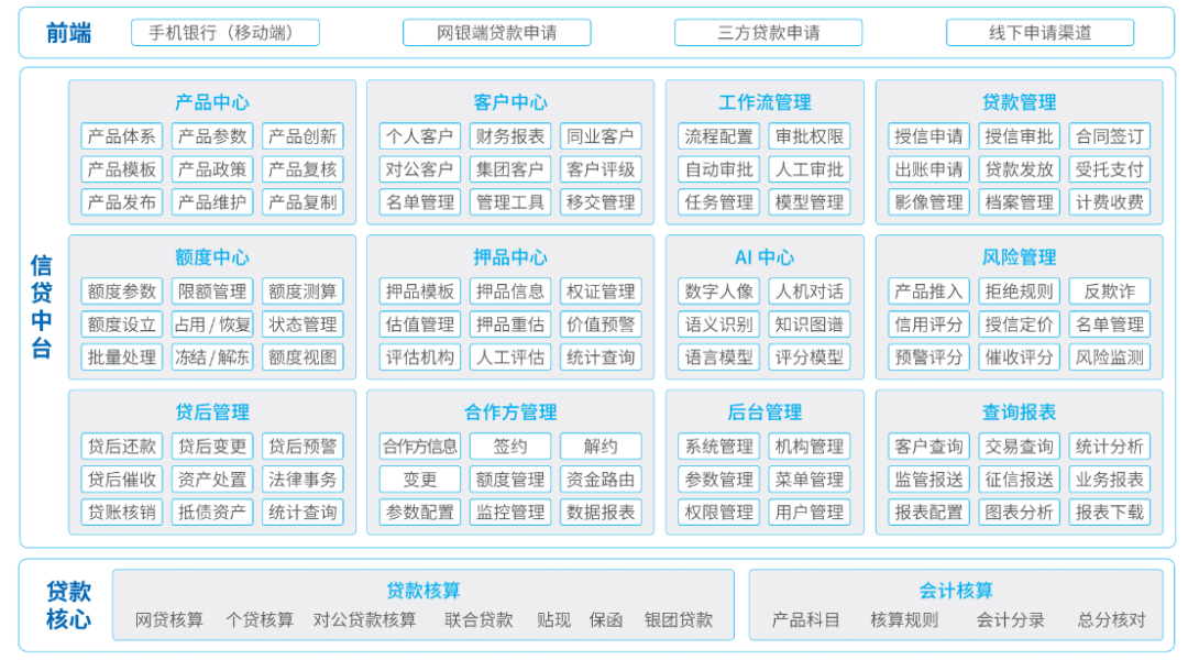 智能一体化信贷系统,以分布式技术平台为基础,微服务架构体系为设计理念,融合人工智能核心技术,数字人像实时合成、智能人机对话技术、客户面审风险评分模型等,构建网贷、信贷线上线下业务一体化管理平台。通过AI数字人远程面审贷款,实现数字人面审官在线审核借款客户,集成研究院AI面审模型、给出客户风险评分,面审流程动态适配;提升效率、降低风险的同时,通过智能化人机交互提升用户体验,从而使客户能够快速开展信贷业务。帮助银行在相同应用体系下,同时开展互联网贷款业务与传统信贷业务,并将贷款核心从传统核心系统剥离出来,建立独立贷款核心,完成信贷中台改造,为信贷管理与贷款核算一体化提供了完整解决方案。