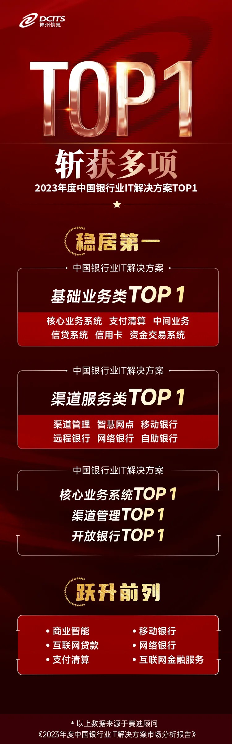 7月9日,赛迪顾问发布《2023年度中国银行业IT解决方案市场分析报告》,报告显示,神州信息2023年度在基础业务类、渠道服务类、核心业务系统、渠道管理及开放银行等领域继续保持领导地位,在数据智能、信贷系统、移动银行、网络银行以及市场风险等领域都取得新的进展。
